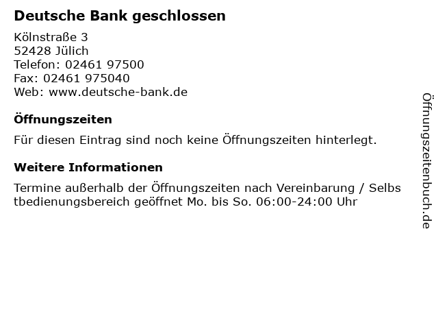 öffnungszeiten adressen prospekte angebote telefonnummer finde alle infos zur geschäftsstelle in 52428 jülich. Diese anbieter aus der umgebung bieten auch dienste in jülich an. Deutsche bank ag sees its investment bank performing in line or better than recent guidance given by competitors after some of the trading momentum from the first half of the year carried over. The 50 year old banker now has to annually certify that the german lender is adhering to a.